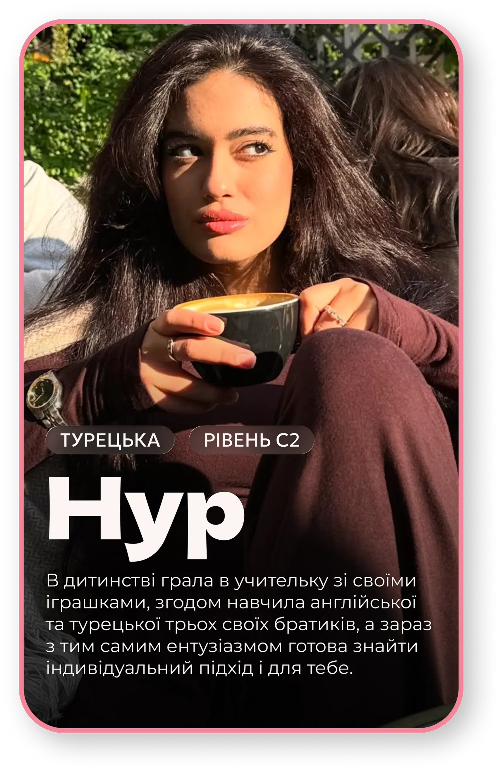 Не має значення, чи твоя мета – вивчити турецьку мову для життя чи для кар'єри. Наші досвідчені тічери складуть для тебе персональний план навчання, який буде цілеспрямовано рухати тебе до результату. Забудь про стандартні програми – твоя мовна освіта буде створена саме для тебе.