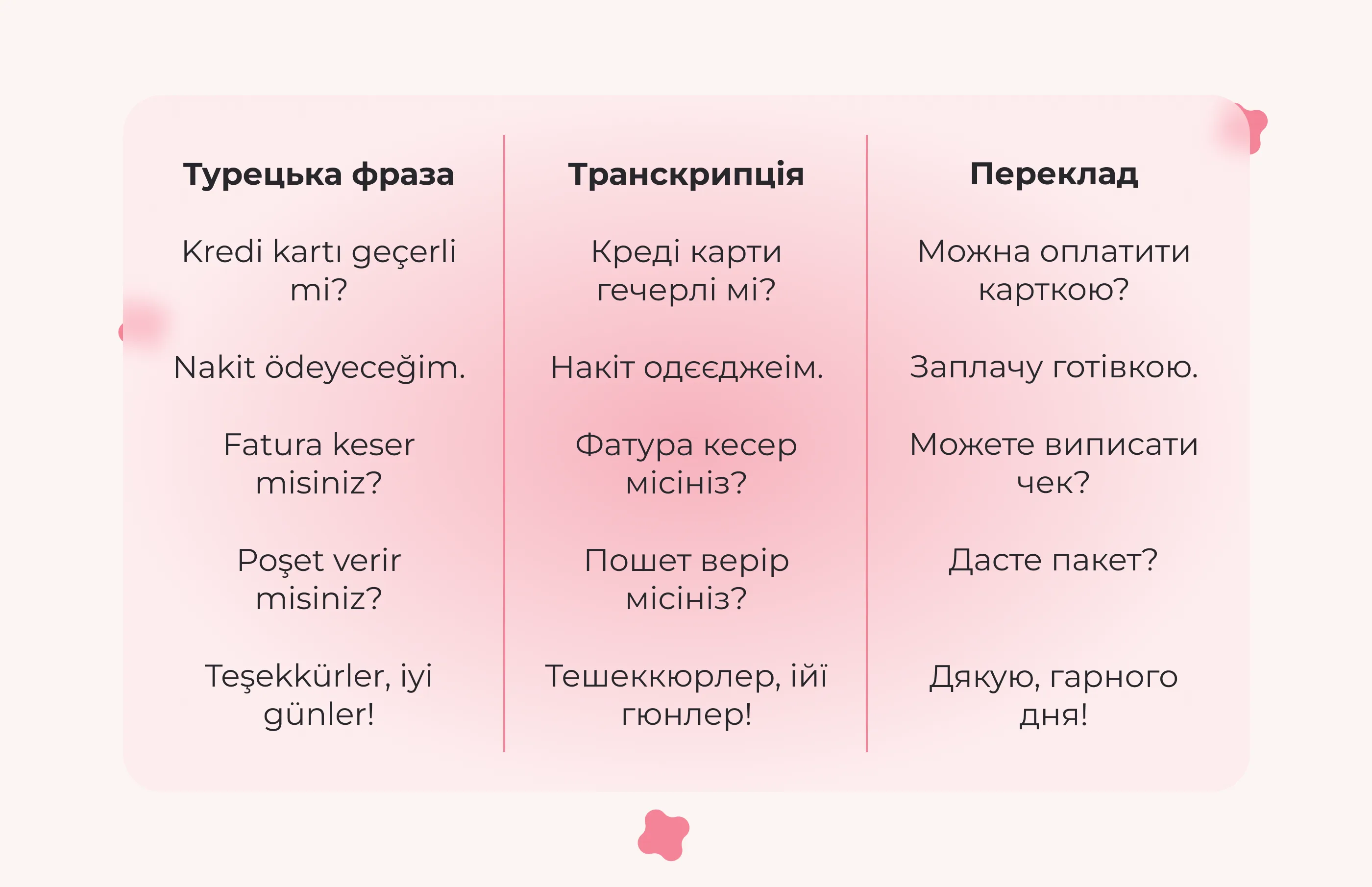 У цій статті ми зібрали найнеобхідніші вирази, розділивши їх за ситуаціями: від привітання до оплати. Ви також дізнаєтеся, де і як доречно торгуватися, та які способи оплати є найзручнішими в Туреччині.